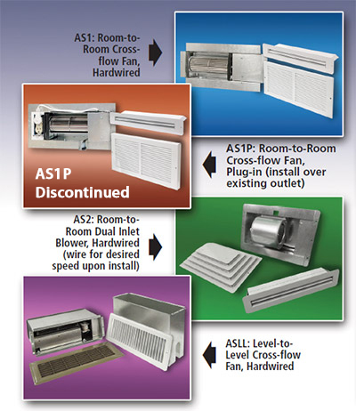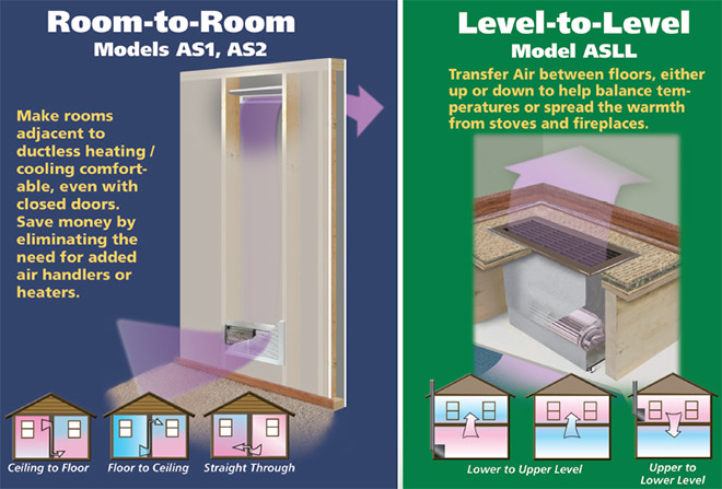 AireShare AS1 & AS2 Room-to-Room transfer fans pull cool air from floor level or warm air from ceiling level and distribute high or low.