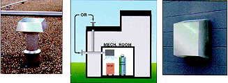 The IN-FORCER can be ducted up to 100 equivalent feet from the intake hood. Even isolated mechanical rooms can be easily supplied with outdoor combustion air. Cold outdoor air can be distributed through standard ducts and diffusers at ceiling level, allowing the air to be tempered as it drops to the floor, eliminating cold spots in the Mechanical room.  Mechanical room noise transfer to the outside is further reduced since there is no direct wall opening, typical of standard louvers.