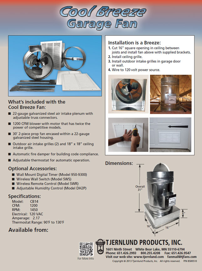 The fan pulls hot air from the garage ceiling and exhausts it into the garage attic space where it exits out the ridge, roof or gable vents. Outdoor air replaces the hot exhaust to lower air temperatures and reduce the thermal heat gain of the floor, structure and contents. |